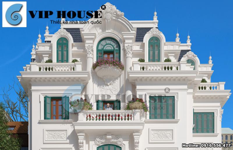 Hệ thống cột trụ vững chắc ôm lấy toàn bộ công trình kết hợp các đường phào, chỉ và hoa văn trang trí tinh tế mang đặc trưng của những thiết kế tân cổ điển. Những chậu hoa được trồng ở lối ban công tô điểm thêm vẻ đẹp tươi mới, và sự lãng mạn cho ngôi nhà.