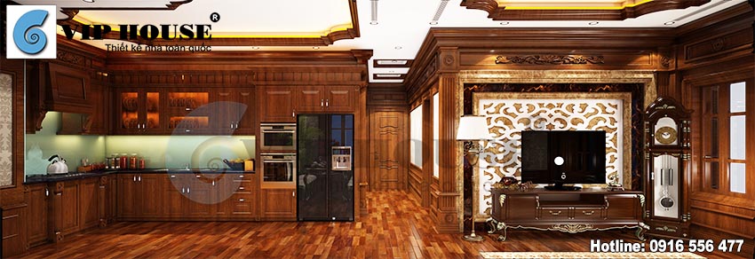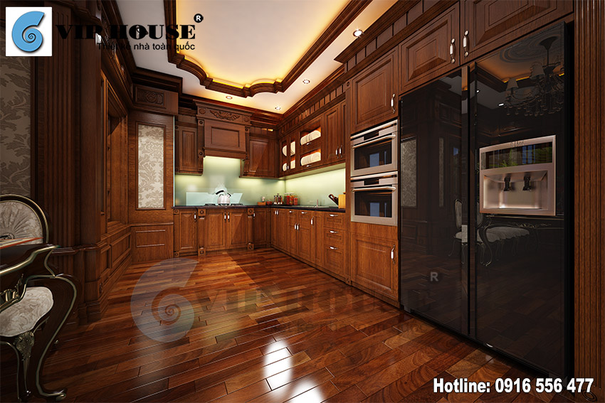 Căn phòng bếp với đầy đủ nội thất tiện nghi đều làm từ chất liệu gỗ sang trọng và ấm cúng, khu bếp gần với bàn ăn phía ngoài phòng khách thuận tiện cho người nội trợ và sinh hoạt cho cả gai đình.