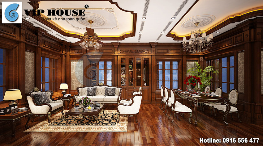 Thiết kế nội thất tân cổ điển của căn biệt thự là phần chủ đầu tư hài lòng ngoài mong muốn, toàn bộ nội thất phòng khách được làm từ chất liệu gỗ cao cấp , sắc nâu trầm luôn đem đến cảm giác ấp áp cùng với vẻ đẹp sang trọng rất riêng trong thiết kế cổ điển.Xung quanh phòng khách được bố trí các ô cửa sổ xen kẽ các khung với giấy dán tường hoa văn tinh tế ấn tượng cho căn phòng.Bộ sofa và bộ bàn ăn đều được bọc nệm khung gỗ với những đường cong nhẹ nhàng, tinh tế cùng với gam trắng làm nổi bật cho cả căn phòng.