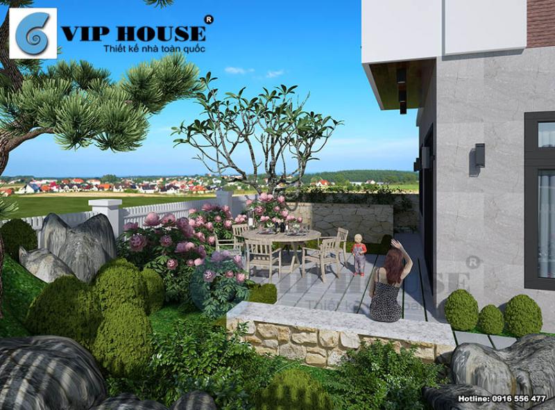 Thiết kế sân vườn với tiểu cảnh vô cùng đẹp mắt, tiểu cảnh xanh cùng các khóm hoa màu sắc tươi sáng kết hợp lối đi lát đá màu trắng sáng tạo nên một khung cảnh rất nên thơ và trữ tình.
