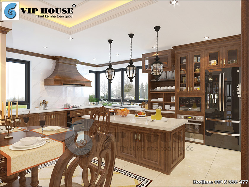 Thiết kế nội thất tân cổ điển phòng bếp ăn với tâm điểm là bộ bàn ghế ăn chất liệu gỗ cao cấp mang đến những phút giây thư giãn và ăn uống thoải mái, đầm ấm cho cả gia đình.