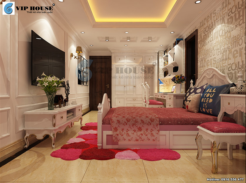 Thiết kế nội thất tân cổ điển phòng ngủ con gái ngọt ngào và lãng mạn với cách sử dụng tone màu hồng và trắng đầy tinh tế, thời thượng.