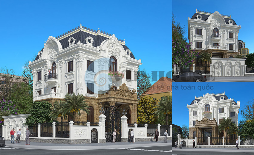 Trên khu đất rộng gần 800 mét vuông vô cùng rộng rãi là căn biệt thự lâu đài vô cùng nguy nga, tráng lệ thu hút bao ánh nhìn của người qua đường. Thiết kế biệt thự được kts vận dụng các nét đặc trưng của phong cách cổ điển Pháp mang lại vẻ đẹp sang trọng, quyền quý và lộng lẫy cho công trình. Phối cảnh 3 tầng căn biệt thự hiện lên là hình khối chặt chẽ, cân đối sủ dụng các chi tiết phào chỉ và hoa văn trang trí làm điểm nhấn.