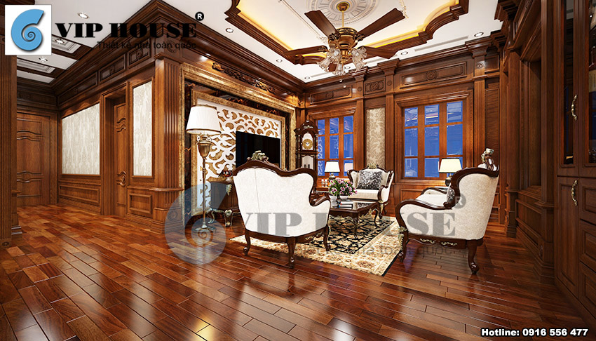 Thiết kế nội thất tân cổ điển phòng khách sử dụng đồ nội thất gỗ làm chủ đạo mang đến vẻ đẹp sang trọng, chất liệu gỗ giúp không gian sinh hoạt chung ấm áp trong mùa đông và mát mẻ khi mùa hè tới.
