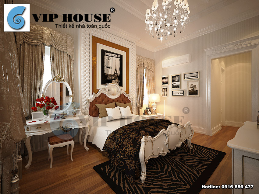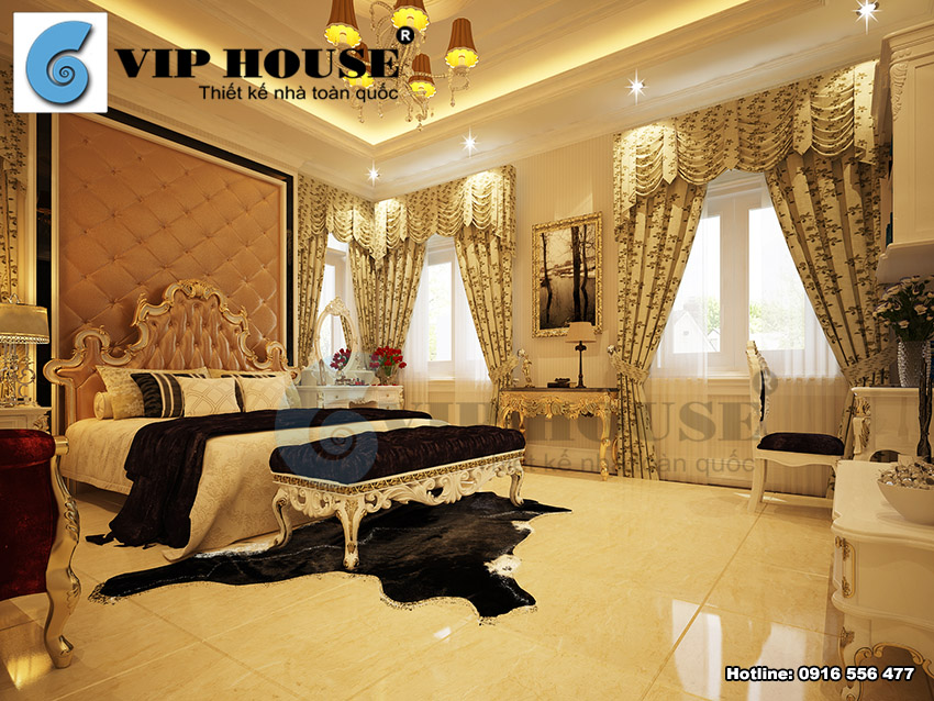 Thiết kế nội thất tân cổ điển phòng ngủ master sử dung tone màu vàng kim là màu sắc chủ đạo mang đến cái nhìn sang trọng và tinh tế vô cùng lãng mạn.