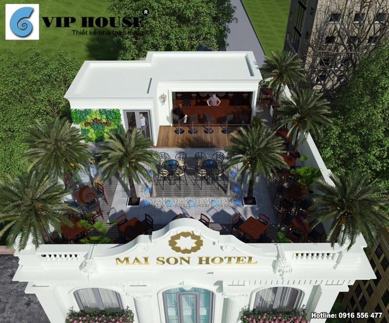 Không gian tầng mái của khách sạn được lựa chọn làm quầy bar và cafe. Không gian kinh doanh trên cao chính là một lĩnh vực mới, táo bạo đòi hỏi sự sáng tạo linh hoạt, với sự thông minh của mình, kiến trúc sư Vip House đã mang đến cho chủ đầu tư một ý tưởng kinh doanh hợp thời và độc đáo nhất khiến nhiều người sẽ tò mò về một quán cafe trên tầng mái của khách sạn 9 tầng.