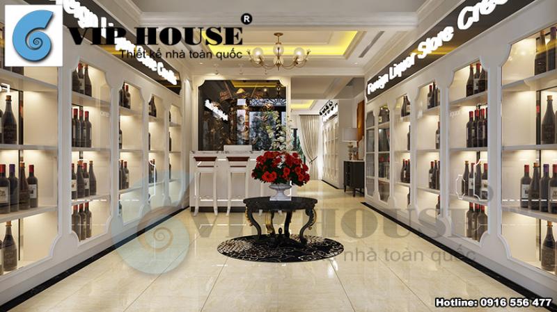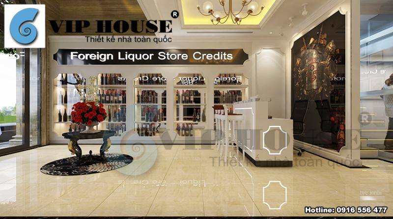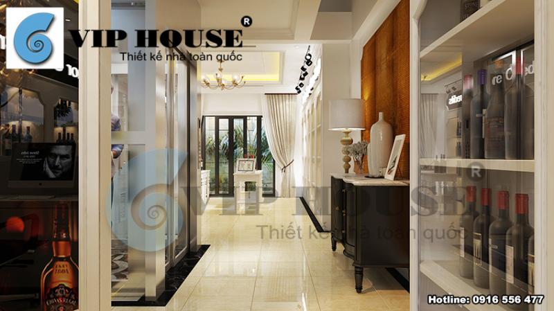 Không gian dành riêng cho showroom trưng bày rượu của mẫu thiết kế nhà phố tân cổ điển được bố trí song song và đối xứng nâng bước chân của khách hàng đến không gian của nhà hàng phương Tây sang trọng và đẳng cấp.