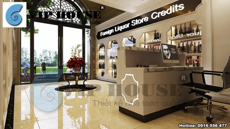 Cùng ghé thăm những cách bố trí không gian trong nội thất của nhà phố tân cổ điển để ta cảm nhận rõ hơn về phong cách này qua những hình ảnh sau. Ngay khi đặt chân vào căn nhà phố bạn sẽ bắt gặp ngay quầy lễ tân và những tủ rượu sang trọng với những loại rượu hảo hạng.