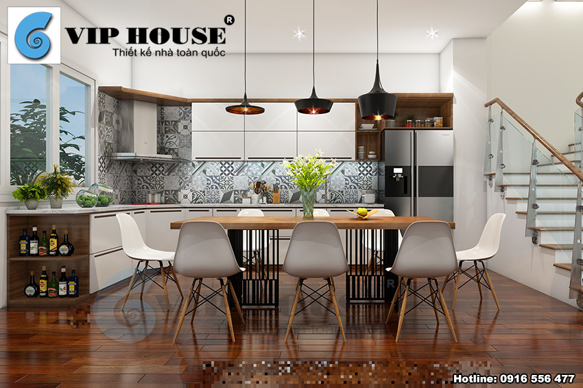 Mẫu thiết kế nội thất đẹp phòng bếp ăn với tone màu trắng nổi bật kết hợp cùng chất liệu gỗ đã đem đến một khu vực ăn uống ấn tượng.