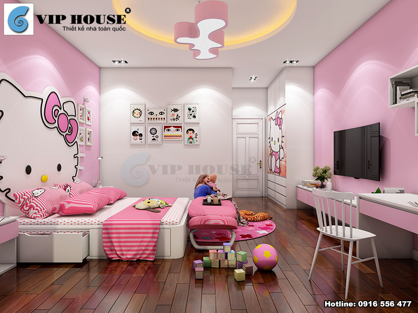 Mẫu thiết kế nội thất đẹp phòng ngủ con gái đáng yêu với tone màu hồng đáng yêu cùng những món đồ trang trí ngộ nghĩnh như chính sự ngọt ngào trong tính cách cô con gái.