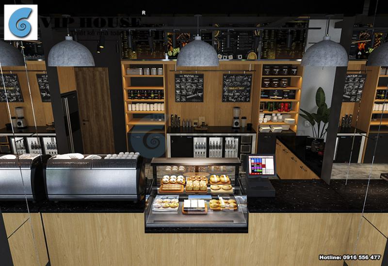 Quầy bar, quầy pha chế được thiết kế bắt mắt với mặt phủ gạch bóng loáng và chất liệu gỗ tự nhiên. Những máy móc hiện đại nhất cũng được trang bị để mang lại chất lượng đồ ăn, thức uống tốt nhất đến cho khách hàng.