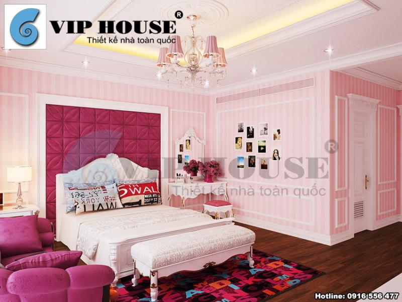 Lựa chọn gam màu hồng chủ đạo trong thiết kế, không gian nội thất tân cổ điển phòng ngủ mang đến sự trẻ trung, phù hợp với lứa tuổi.