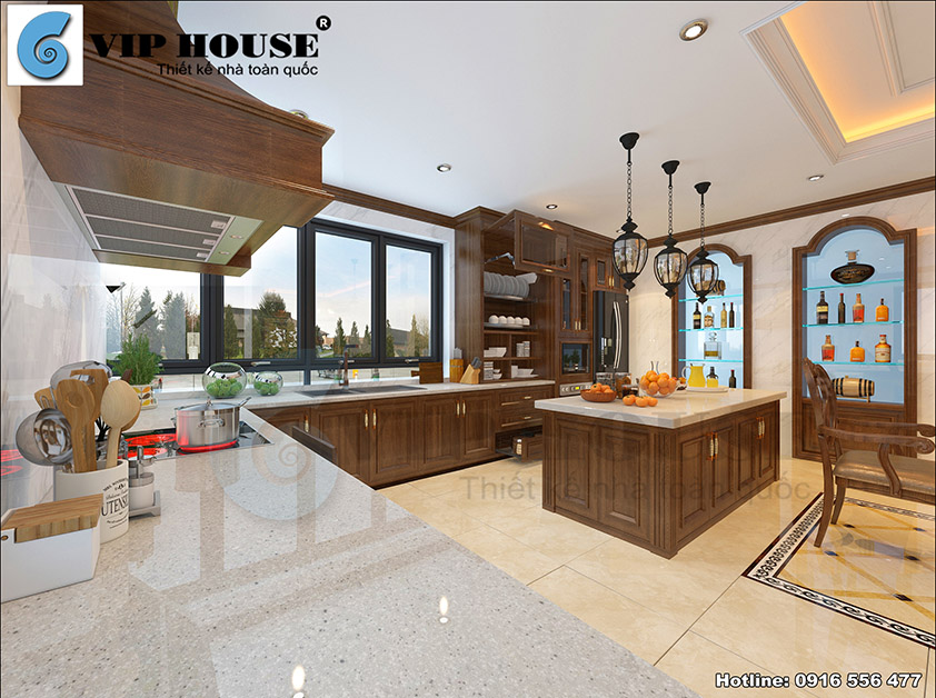 Không gian phòng bếp ăn của mẫu thiết kế nội thất đẹp phong cách tân cổ điển còn khiến người xem liên tưởng đến không gian của nhà hàng Tây sang trọng. Sự liên tưởng này tới từ cách thiết kế tủ đựng rượu bằng kính gỗ kết hợp với những khung cửa sổ mái cong vòm.