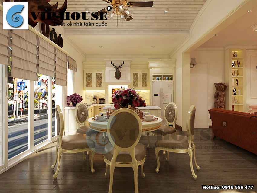 Thiết kế nội thất tân cổ điển phòng bếp ăn với những món đồ nội thất cao cấp, tiện nghi phù hợp với mục đích sử dụng và sở thích của chủ nhân ngôi nhà.