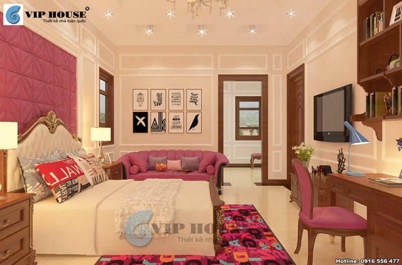 Thiết kế nội thất phòng ngủ cho con gái đầy trẻ trung, năng động và ngọt ngào với gam màu hồng nổi bật trên nền sơn màu kem nhẹ nhàng. Chiếc giường lớn thiết kế kiểu dáng tân cổ điển là điểm nhấn cho căn phòng.