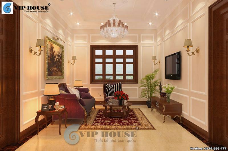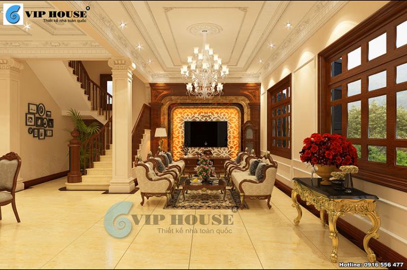 Thiết kế nội thất phòng khách gây ấn tượng mạnh, mẽ với không gian vô cùng sang trọng và tráng lệ được vận dụng khéo léo lối thiết kế tân cổ điển mang lại nét thu hút trong từng đường nét, chi tiết trang trí.