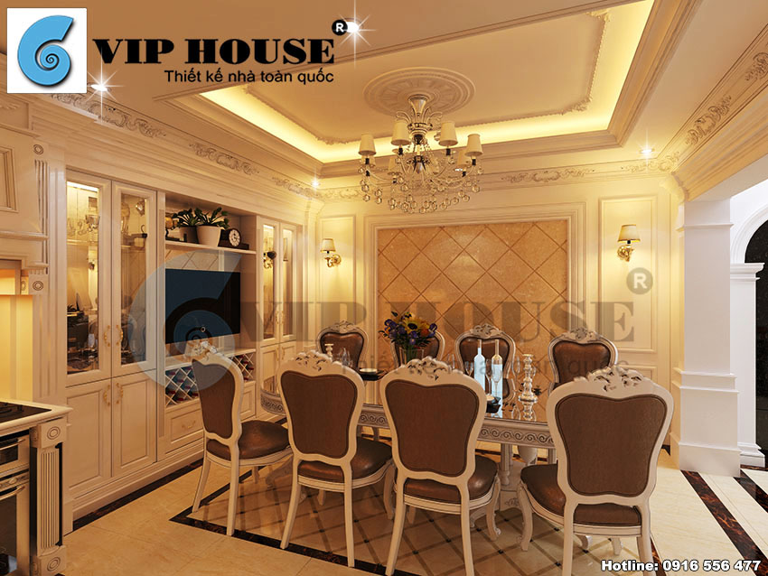 Thiết kế nội thất tân cổ điển phòng bếp ăn vô cùng sang trọng, cách sắp đặt liên thông khiến cho các thành viên trong gia đình có được sự tiện nghi tối đa khi sử dụng không gian sống của mình