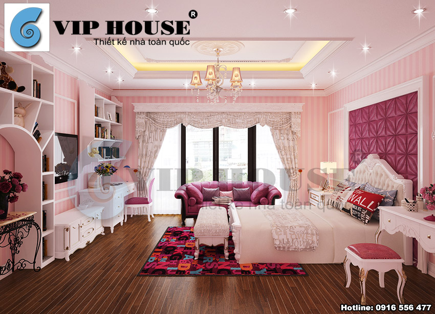 Sắc hồng nữ tính và dịu dàng giúp căn phòng mang vẻ đẹp ngọt ngào, sự kết hợp 2 màu trắng hồng cùng sàn gỗ nâu bóng chính là sự kết hợp màu sắc hoàn hảo cho căn phòng này.