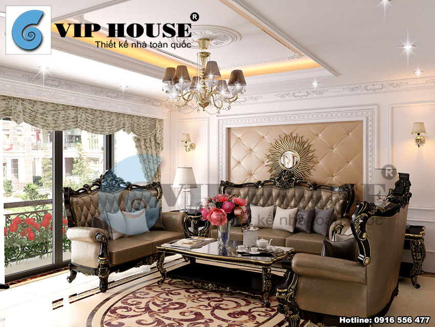 Phòng khách tân cổ điển sở hữu những món đồ nội thất được kts lựa chọn kỹ lưỡng vừa theo sở thích của gia chủ lại vừa thể hiện được nét đẹp của phong cách kiến trúc tân cổ điển