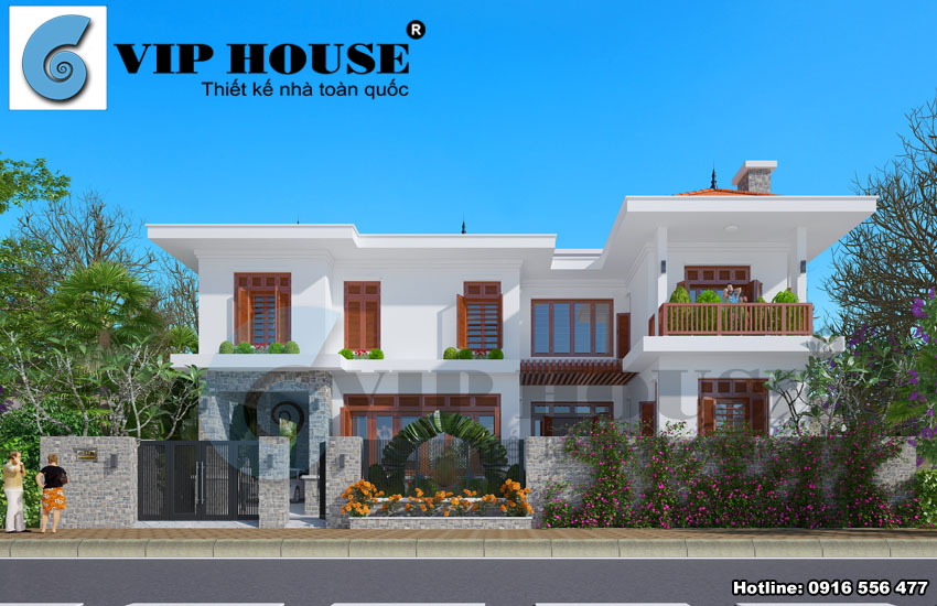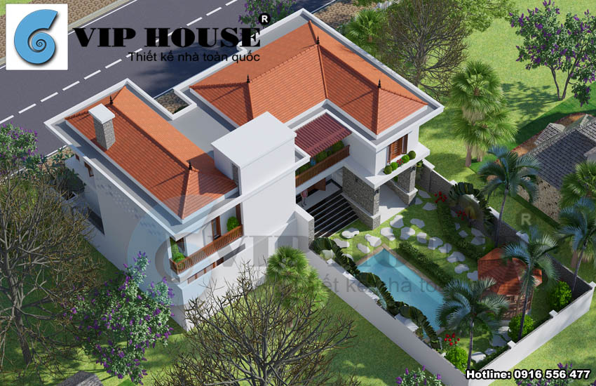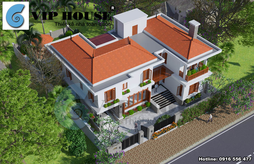 Thiết kế biệt thự hiện đại kết hợp truyền thống là những ngôi biệt thự đẹp có được vẻ đẹp hết sức ấn tượng khi được tổng hợp những vẻ đẹp từ kiến trúc hiện đại phóng khoáng mới mẻ và tươi sáng trong khi đó lại có được cái hồn của vẻ đẹp truyền thống rất dung dị nhẹ nhàng và bình yên. Tiếp tục trình làng mẫu thiết kế biệt thự đẹp ấn tượng và độc đáo, trong bài viết hôm nay chúng tôi trân trọng mời quý vị bạn đọc cùng tham khảo mẫu thiết kế biệt thự hiện đại kết hợp với truyền thống 2 tầng mái ngói đỏ đẹp tại Đan Phượng – Hà Nội. Thiết kế biệt thự 2 tầng kết hợp giữa hiện đại và truyền thống sẽ mang lại cho ngôi nhà của gia chủ một nét đẹp cuốn hút và dung dị như chính con người chủ nhân của nó. Dưới đây là những hình ảnh phối cảnh cùng mặt bằng công năng mẫu nhà biệt thự đẹp 2 tầng của gia đình ông Tạo được Vip house đăng tải trên website viphouse.vn với mục đích tạo nguồn tư liệu tham khảo hữu ích cho quý bạn đọc và khách hàng.