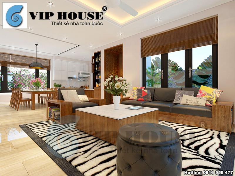 Thiết kế nội thất phòng khách với vẻ đẹp sang trọng, trang nhã cùng với cách sắp xếp các đồ đạc khoa học, nghệ thuật cùng những màu sắc trẻ trung, nổi bật. Bao trùm căn phòng chủ yếu là nội thất gỗ với gam màu nâu mang lại cảm giác ấm cúng, gần gũi.