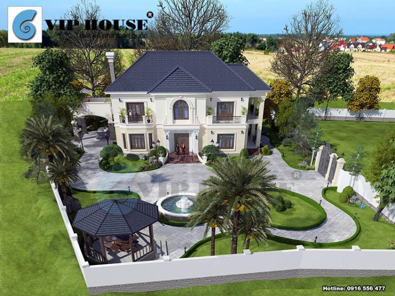 Thiết kế biệt thự đẹp sở hữu không gian sân vườn rộng rãi với những lối đi nhỏ uốn lượn xen kẽ là những cây cảnh. Kiến trúc sư Vip House còn sắp xếp lầu thưởng trà và đài phun nước nhỏ với hi vọng mang lại sự thư giãn tối đa cho các thành viên của gia đình.