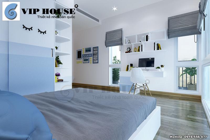 Bàn học và giá sách của bé được sắp xếp và đặt ở vị trí gọn gàng có ánh sáng tự nhiên. Một trong những đặc trưng không thể thiếu của thiết kế nội thất phòng ngủ hiện đại đó là mang đến sự trẻ trung năng động cho không gian mà nó có mặt, trong mẫu thiết kế này kiến trúc sư Vip House đã thể hiện một cách xuất sắc điều đó.