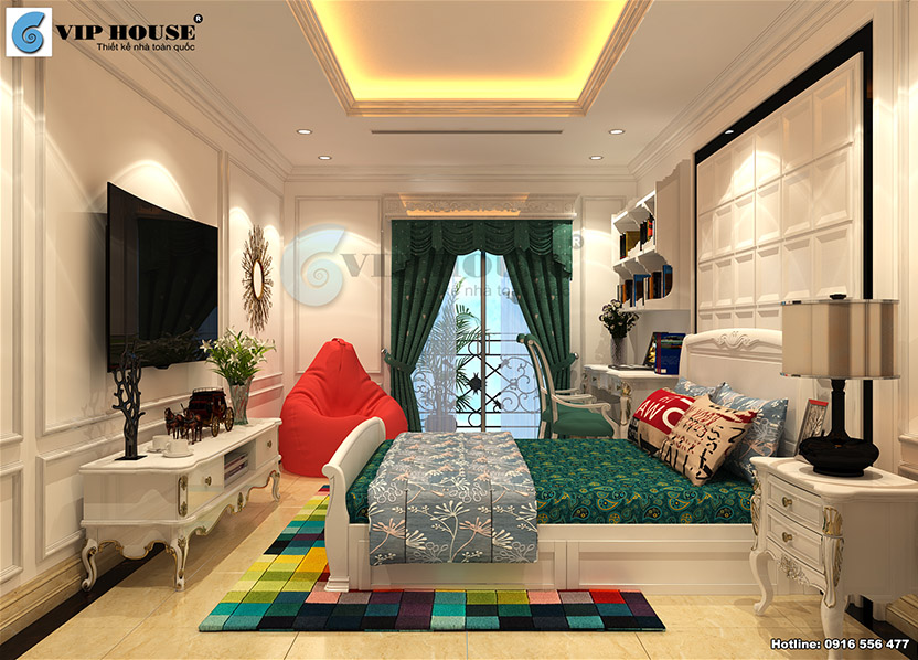 Thiết kế nội thất phòng ngủ tân cổ điển này ấn tượng với gam màu sinh động như xanh hay đỏ nổi bật trên nềm trắng tinh khôi của tường và trần nhà. Bàn làm việc và tủ sách đặt cạnh cửa sổ cũng là sự sắp xếp khéo léo của các kts.