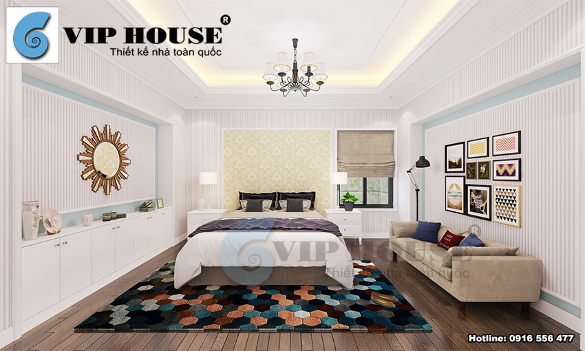 Không gian nghỉ ngơi này có điểm nhấn nổi bật là những bức tường dán giấy dán tường màu trắng xám, mặt phẳng trần và đường chỉ đường thiết kế tỉ mỉ giúp căn phòng ngủ trở nên ấn tượng và hấp dẫn hơn.