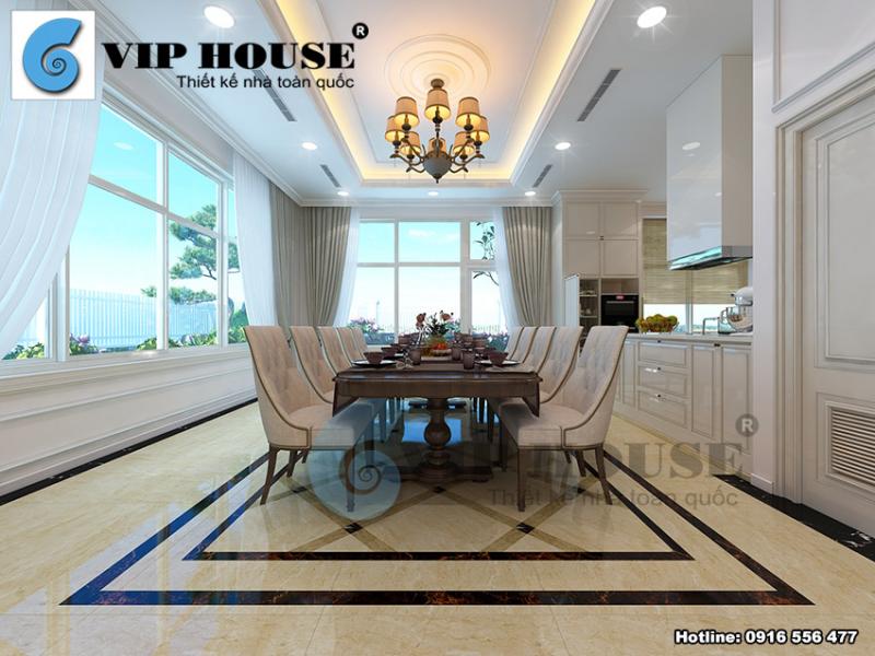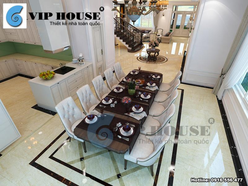 Bếp ăn sang trọng với bàn ghế hiện đại mở ra khung cảnh bữa ăn sang trọng với những món ăn thịnh soạn. Không gian bếp cũng mang đậm nét đẹp tân cổ điển thống nhất với phong cách nội thất chủ đạo của cả công trình.