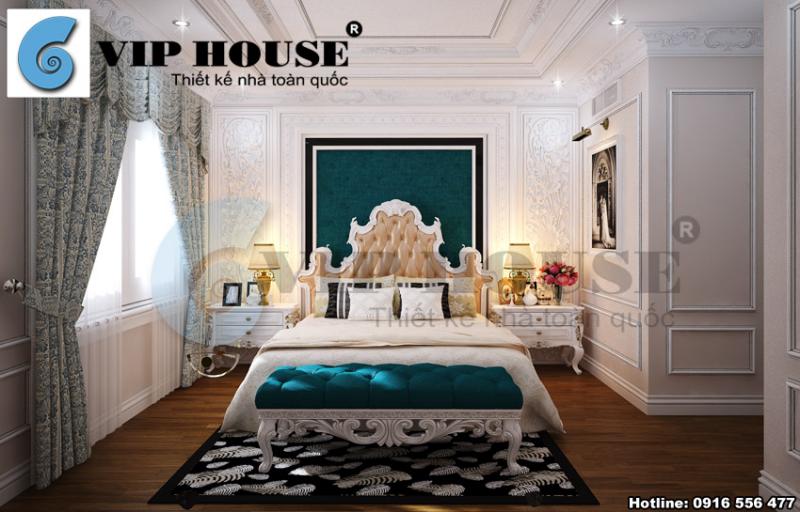 Chiếc giường ngủ sang trọng với những nét chặm khắc tinh tế . Màu xanh ngọc được lựa chọn kết hợp sử dụng với màu trắng ngọc chủ đạo của căn phòng khiến cho phòng ngủ Master mang phong thái hoàng gia.Trần nhà với những chi tiết phào chỉ giật cấp tô điểm thêm vẻ đẹp của tường và trần nhà,tất cả nội thất đều mang vẻ đẹp sang trọng tinh tế.