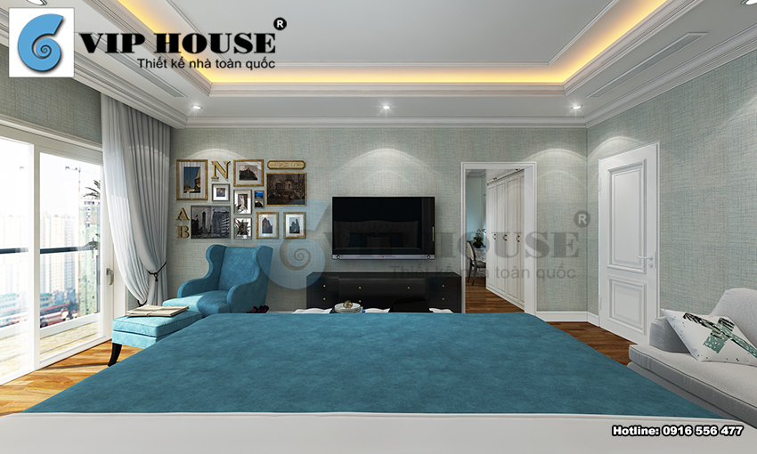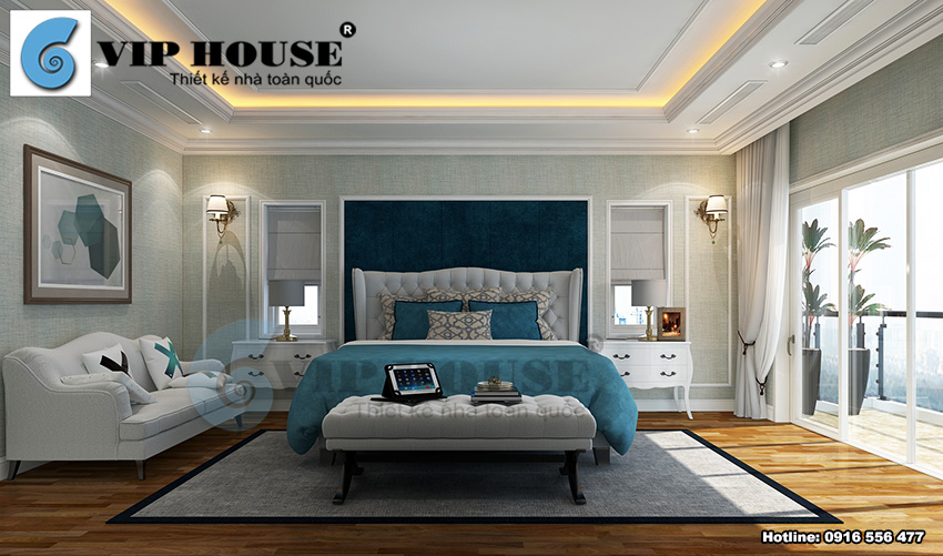 Phòng ngủ master với giấy dán tường trắng xám đơn giản kết hợp với giường ngủ và ghế sofa màu xanh dương mang lại một không gian nghỉ ngơi thư giãn vô cùng yên bình, nhẹ nhàng đầy cuốn hút, cho chủ nhân những phút giây thú vị và thanh bình nhất.