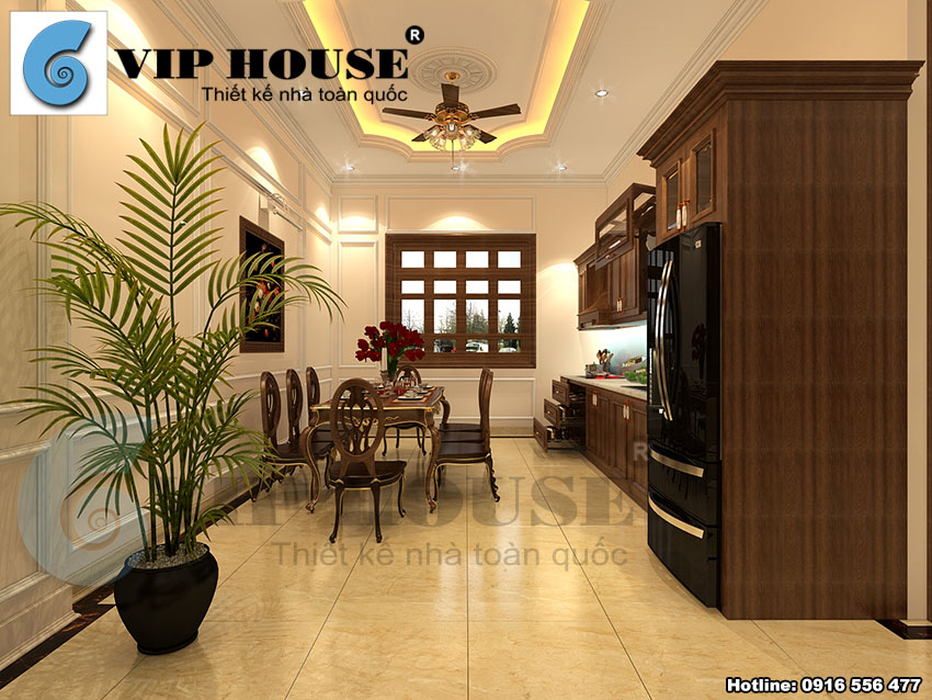 Hệ thống bếp nấu, tủ lạnh cùng tủ gỗ được bài trí đầy đủ mang tới sự tiện nghi cho bữa ăn ngon gia đình. Những đường viền hoa văn mạ vàng trang trí trên các món đồ nội thất càng tăng thêm vẻ đẹp sang trọng đầy cuốn hút cho mẫu thiết kế nội thất.
