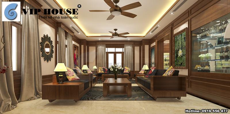 Phòng khách được bố trí gỗ chủ đạo, vì là chủ doanh nghiệp nên lượng khách mà chủ nhà phải tiếp khá nhiều nên theo yêu cầu của anh kts bố trí khu vực khách thật rộng với sức chứa lớn. Điểm nhấn trên diện tường là tranh và gương trang tí, vách gỗ để ti vi lớn.