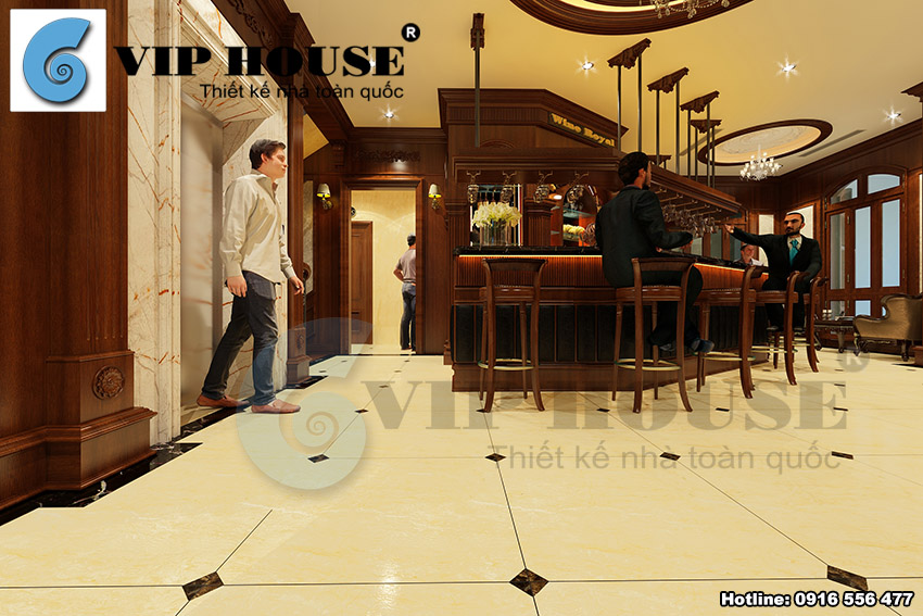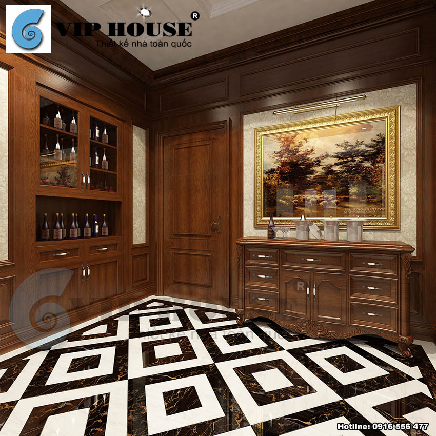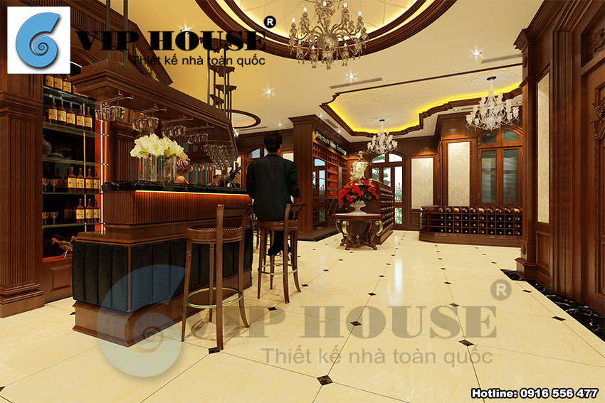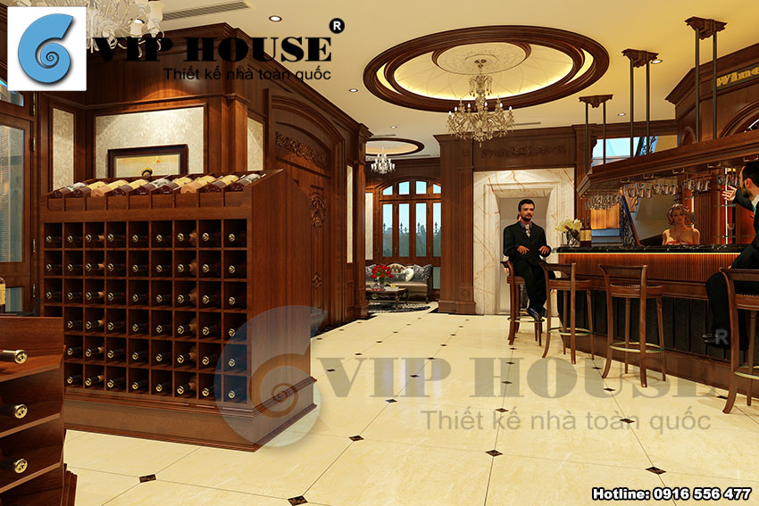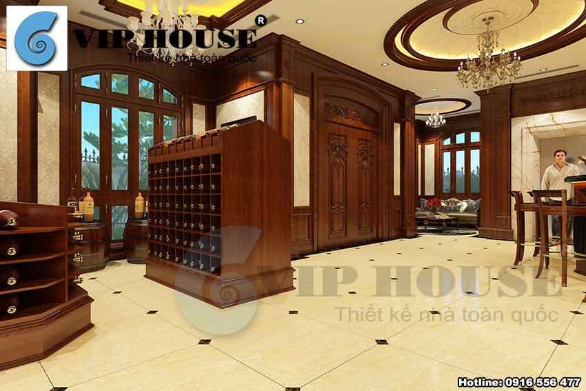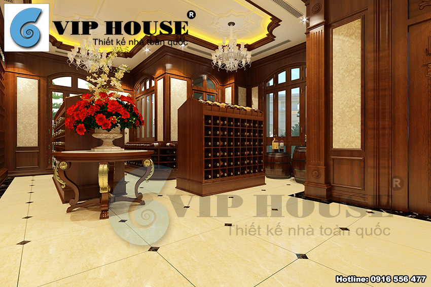 Không gian tầng hầm choáng ngợp với đồ nội thất bằng gỗ sang trọng. Với thiết kế nội thất kiểu Pháp,không gian nơi đây mang vẻ đẹp cổ điển cuốn hút.