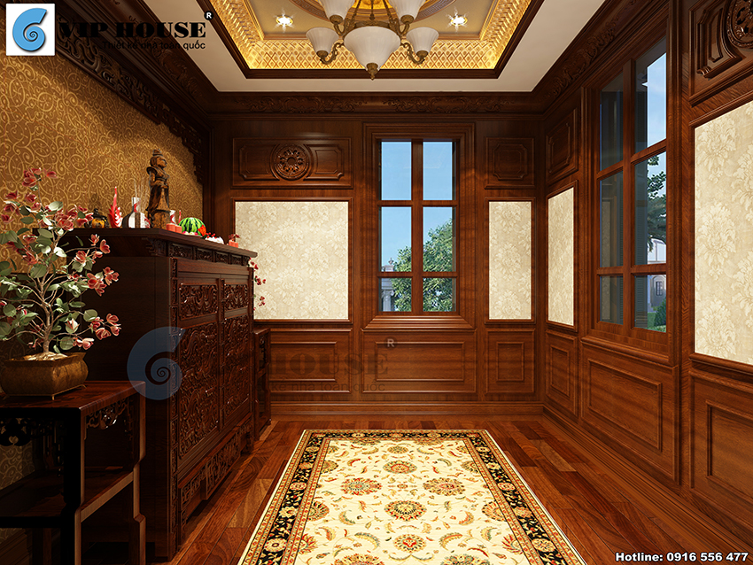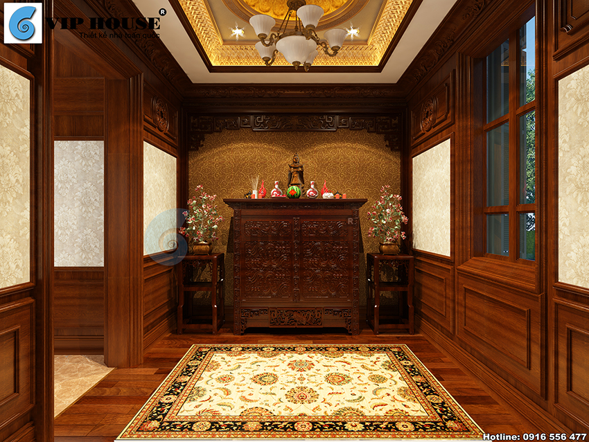 Không gian phòng thờ trang trọng được phủ bởi những tone màu trầm ấm. Đồ được sử dụng trong căn phòng được làm từ gỗ kết hợp với sàn gỗ góp phần làm tăng thêm sự linh thiêng cho nơi thờ cúng tổ tiên.