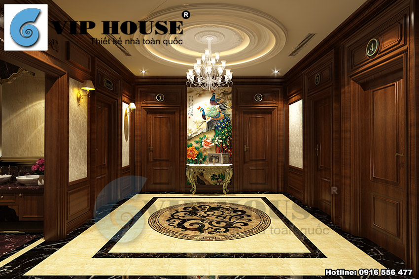Sảnh chờ dẫn lên không gian tầng 2 quý phái gây ấn tượng bởi bức họa đôi công đẹp mắt.Đá lát sàn với hoa văn ấn tượng hết hợp đèn trùm treo trên trần nhà mang đến sự trang trí đẹp mắt. Đặc trưng của phong cách Pháp ấn tượng lòng người có một phần nhờ những đường phào chỉ giật cấp nhẹ nhàng.Ngước nhìn lên trần nhà ta cảm nhận rõ được điều đó đồng thời thấy được chiều sâu trong cách trang trí của những người thợ tài hoa, khéo léo.