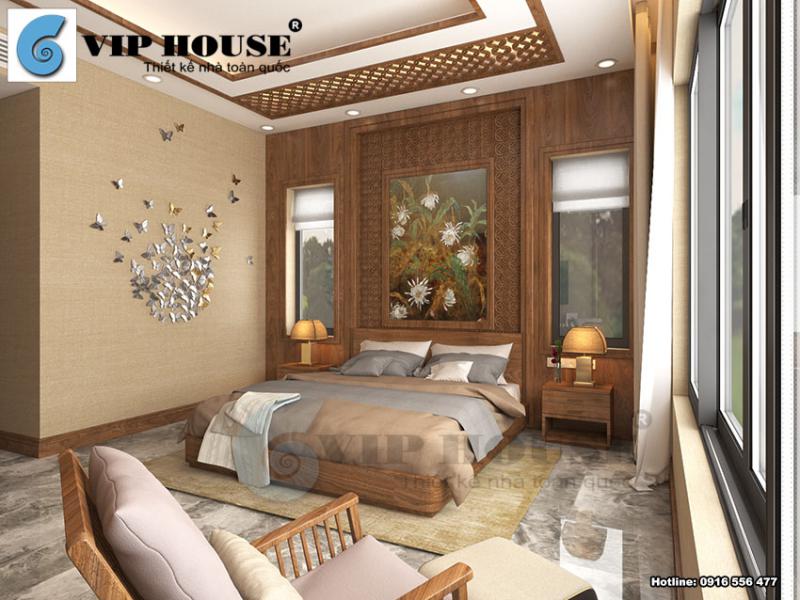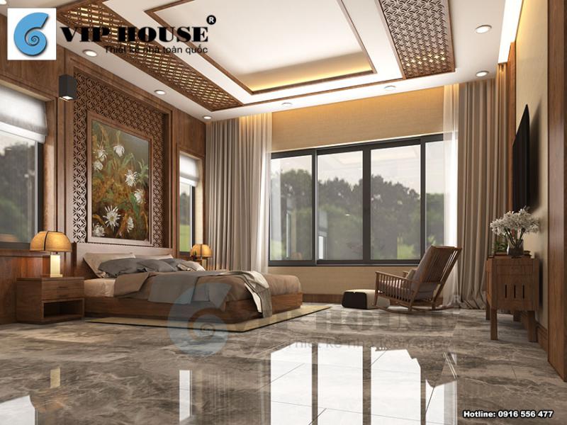 Đặc trưng cơ bản nhất trong thiết kế nội thất hiện đại Á Đông là việc sử dụng những chi tiết đơn giản, mộc mạc để làm nổi lên vẻ đẹp sang trọng tinh tế. Ngay trong không gian phòng ngủ Master của gia chủ người xem cũng có thể thấy rõ điều đó.