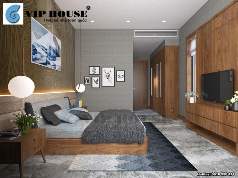 Sự hòa hợp giữa màu sắc ghi xám cùng gam màu gỗ trầm mang đến nơi thư giãn, nghỉ ngơi thoải mái, bắt mắt. Ti vi được đặt ở vị trí đối diện với giường ngủ tạo nên sự thoải mái và giải trí tiện nghi cho gia chủ.