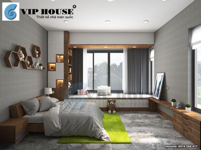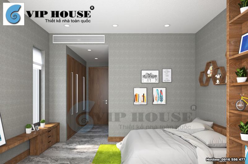 Căn phòng ngủ dành cho con trai nhỏ gia đình vẫn lựa chọn gam màu xám làm chủ đạo và thêm vào đó là sự xuất hiện của màu nâu nhạt đến từ gỗ. Cách sử dụng màu sắc tạo sự nhẹ nhàng và có điểm nhấn xanh lá ở giữa khiến cho căn phòng này thực sự nổi bật.