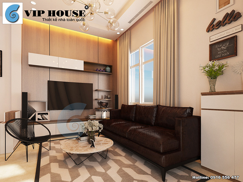 Thiết kế nội thất hiện đại phòng khách với lối thiết kế đơn giản, màu sắc chủ đạo là những gam màu tương phản tạo sự nổi bật ấn tượng, đằng sau chiếc kệ tivi là bức tường ốp gỗ nâu độc đáo, đây chính là điểm nhấn của căn phòng khách thiết kế nhà phố đơn giản.