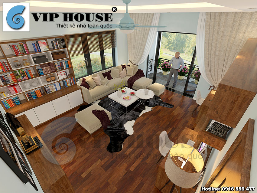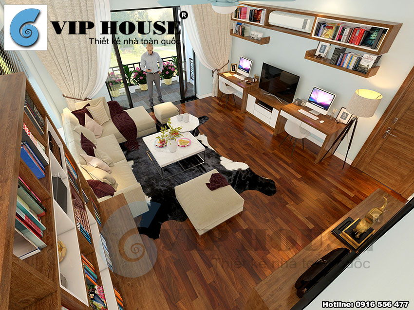 Nền nhà gỗ tối màu tương phản với trần nhà trắng kết hơp với sự bố trí màu sắc nghiêng về hai phía với một bên là tủ kệ bằng gỗ màu trầm,còn một bên là tủ sách ghế sofa sáng màu làm cho không gian mở rộng đa chiều.
