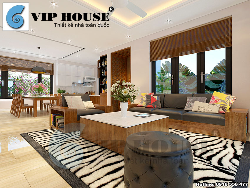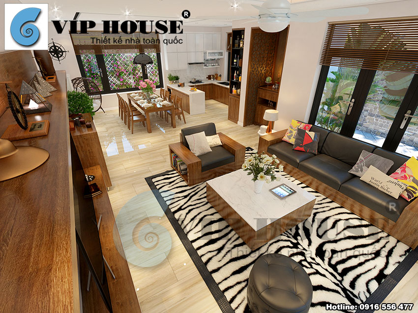 Với không gian chiếm ưu thế phòng khách được bố trí bắt mắt với đồ đạc nội thất chủ yếu được làm từ vật liệu gỗ. Điểm nhấn của căn phòng là bộ bàn ghế gỗ nệm được đặt ở vị trí trung tâm. Thảm trải sàn tối màu xen ké trắng đen càng làm nổi bật hơn cho căn phòng.