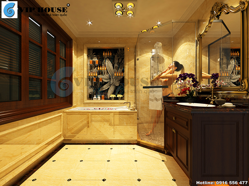 Với căn phòng tắm kèm vệ sinh, kiến trúc sư Vip House mang đến thiết kế hợp với ý của gia chủ bằng việc đặt thêm không gian trưng bày rượu vào trong thiết kế như là một sự giải trí ấn tượng.