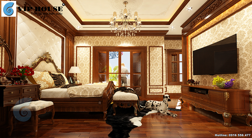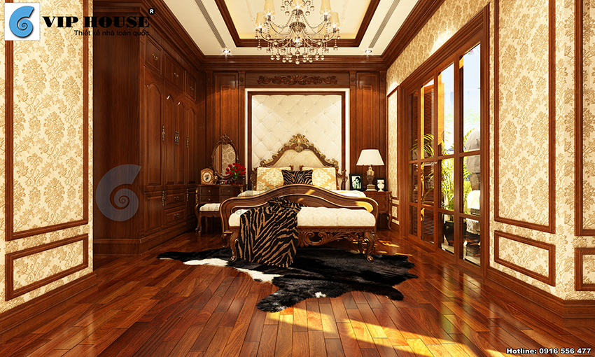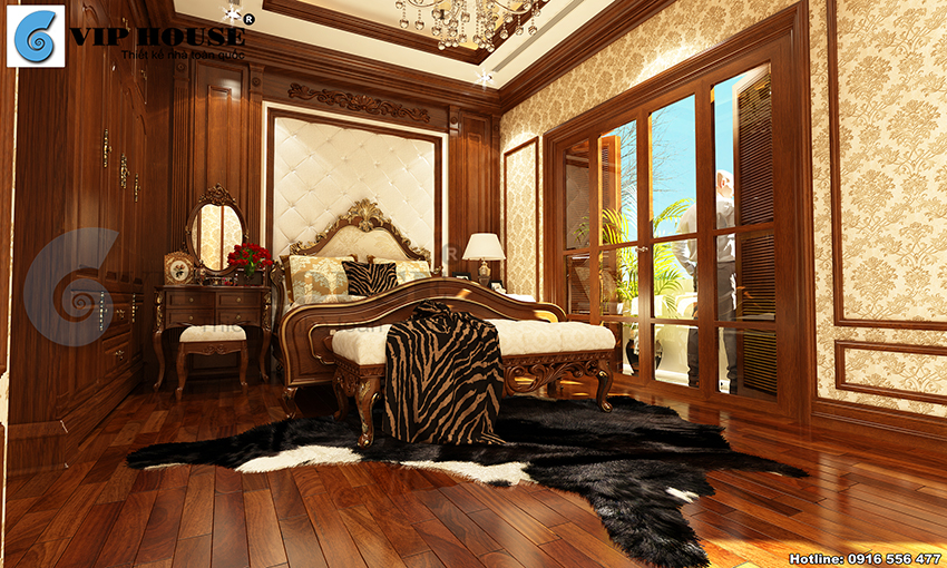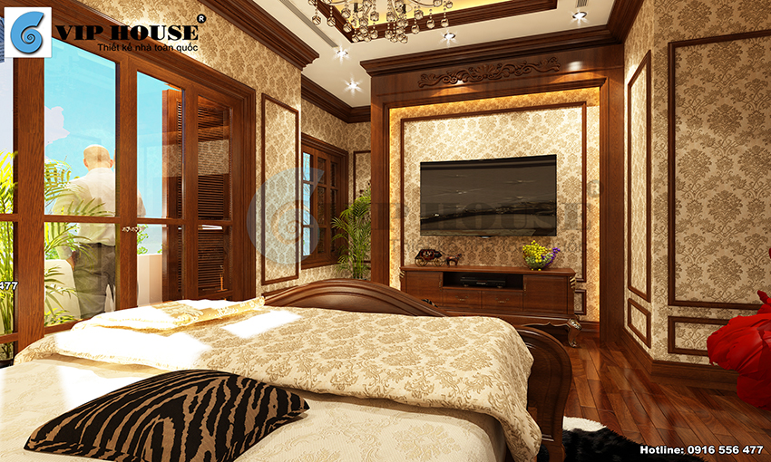 Không gian phòng ngủ Master ghi điểm trong mắt người xem bằng không gian sang trọng cùng sự ấm áp toát ra từ những đồ dùng nội thất hợp lý. Những khung cửa được làm từ chất liệu gỗ, kính kết hợp giúp cho không gian nội thất tân cổ điển thêm phần sáng sủa và thoáng mát.