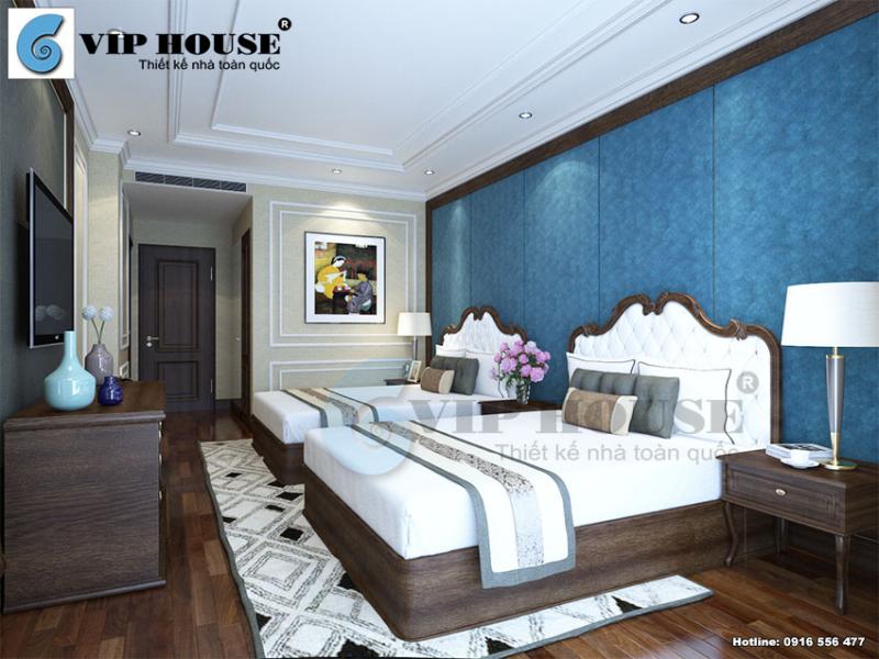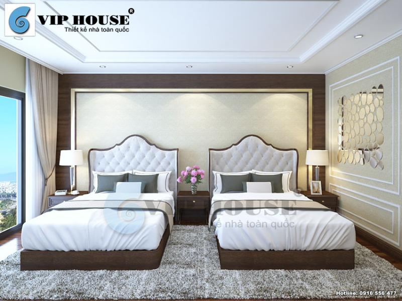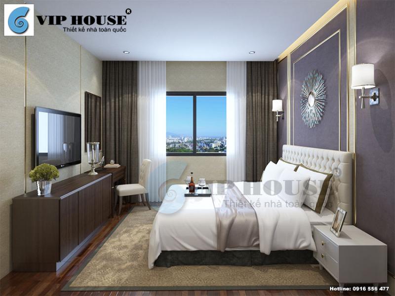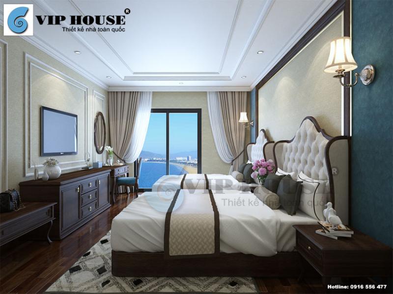 Thiết kế nội thất phòng ngủ khách sạn được kiến trúc sư Vip House sắp đặt nhiều đồ dùng tiện nghi như tủ đồ, ti vi cỡ lớn, giường ngủ sang trọng và tủ quần áo… tất cả đảm bảo quá trình lưu chân của du khách thoải mái nhất.