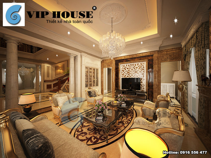 Phòng khách biệt thự với không gian rộng, thoáng, tạo điều kiện để kiến trúc sư có thể phô hết các đường nét đẹp chính của phong cách thiết kế nội thất tân cổ điển, mà không làm không gian trở nên rối mắt