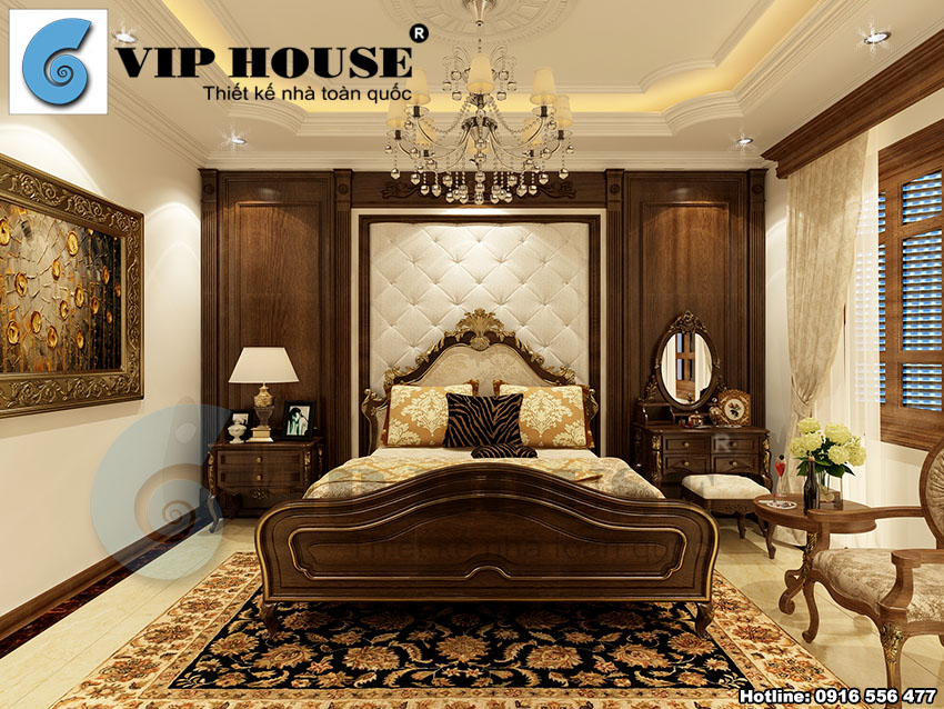 Thiết kế nội thất tân cổ điển phòng ngủ master thể hiện phong cách sống và gu thẩm mĩ riêng của chủ gia đình. Phòng ngủ master được ưu tiên về diện tích, vị trí với các view đẹp của ngôi nhà.