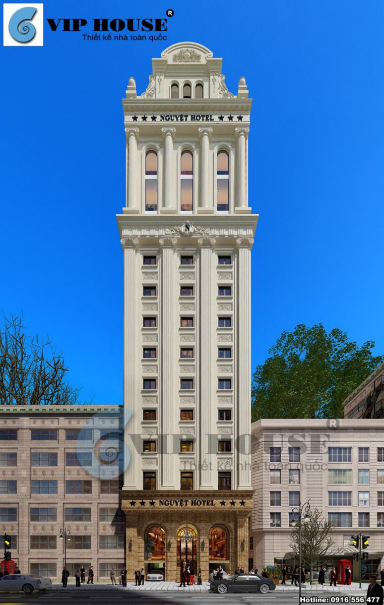 Tổng hợp mẫu khách sạn kiểu Pháp đẹp, ấn tượng – Thiết kế khách sạn cổ điển 3 sao 13 tầng (Hình khối công trình được phân chia rõ ràng và tuân thủ theo tỷ lệ chuẩn của phong cách cổ điển. Đây chính là thành công của Vip House đối với những công trình mang phong cách cổ điển Pháp.)