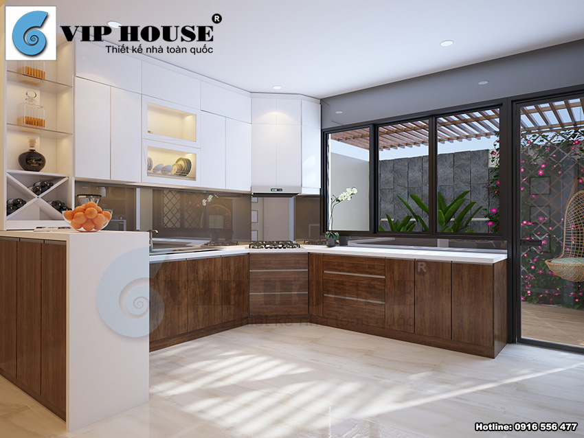 Không gian nội thất phòng bếp được bố trí với đầy đủ công năng sử dụng, chất liệu gỗ chủ đạo, thiết kế trẻ trung và năng động